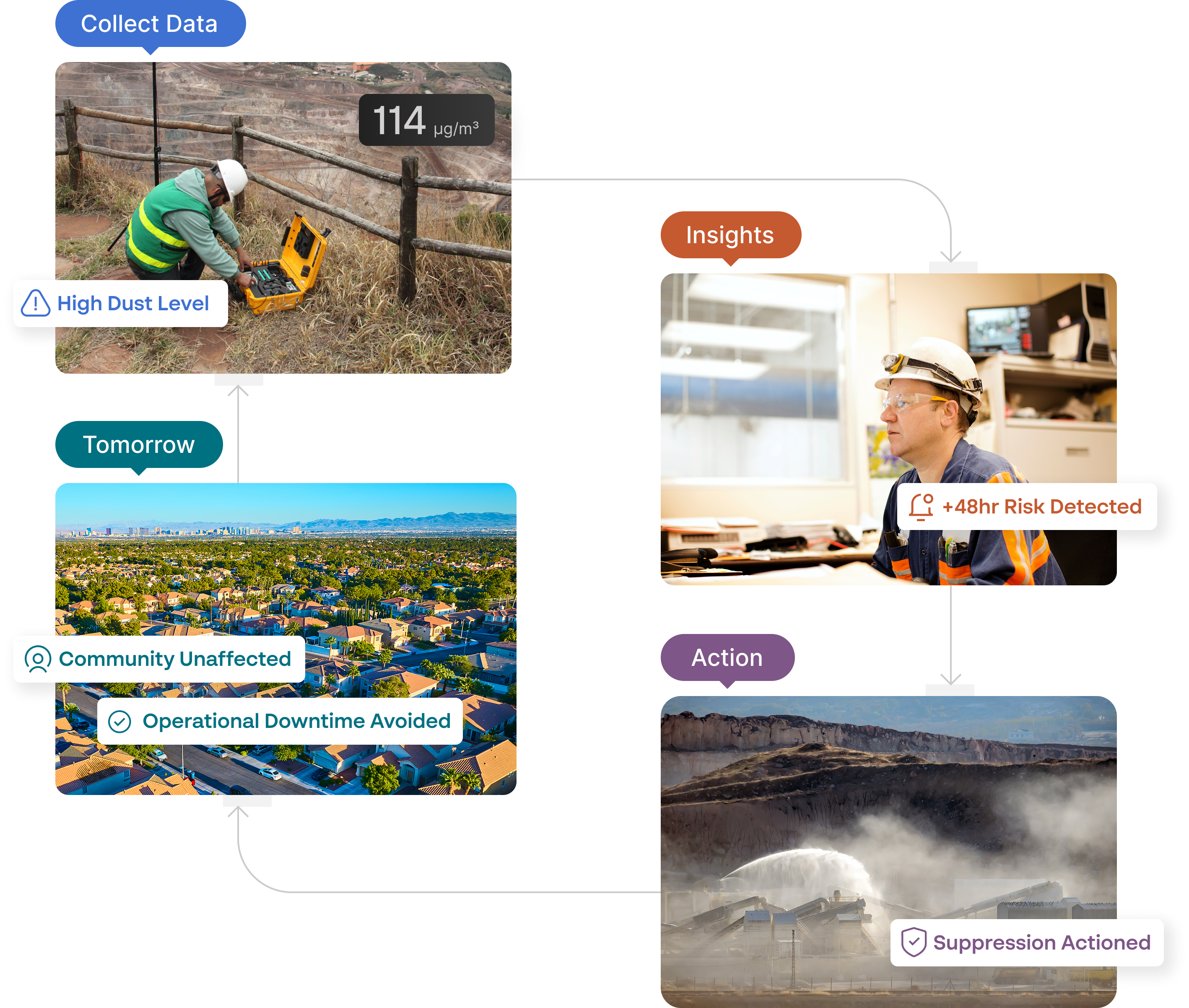 Desde el polvo y el ruido hasta los impactos meteorológicos, nuestras herramientas predictivas le permiten planificar con antelación, reducir el tiempo de inactividad y aprovechar al máximo sus recursos, para que todo funcione sin problemas y con eficacia.