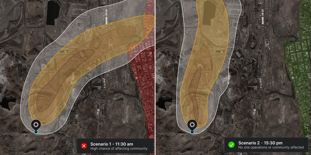 Consider a large coal mine in central Queensland, Australia. Surrounded by a community, the site was under pressure to avoid negative publicity from blast plumes. By using Envirosuite to simulate multiple blast scenarios, the mine identified the safest time to proceed. On a day when conditions threatened to blow fumes towards town, the mine delayed blasting by just two hours—keeping emissions within the lease boundary.